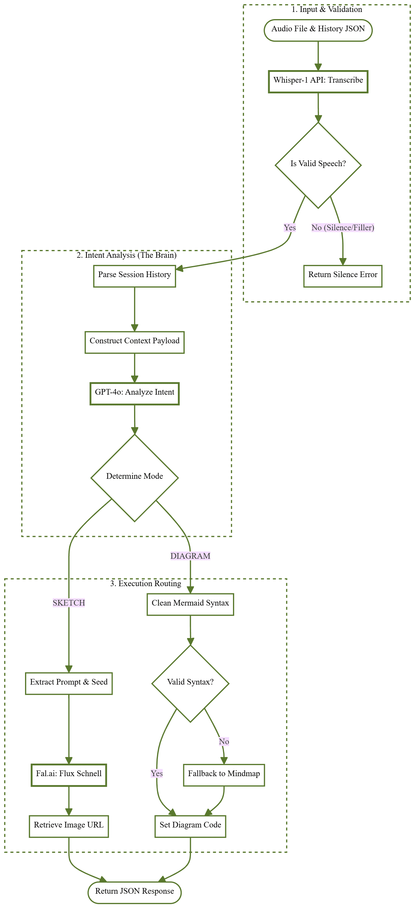 Treating this platform as a shared technical environment meant engineering it to actively prevent miscommunication. I designed the system logic to output both structural diagrams and visual sketches, acting as a collaborative bridge between design and engineering teams. To make the tool reliable and natural to use, I added a strict hallucination filter, universally accessible zipped PDF outputs, and a 2-second silence trigger, a timing anchored in cognitive linguistics research on natural human thought pauses.