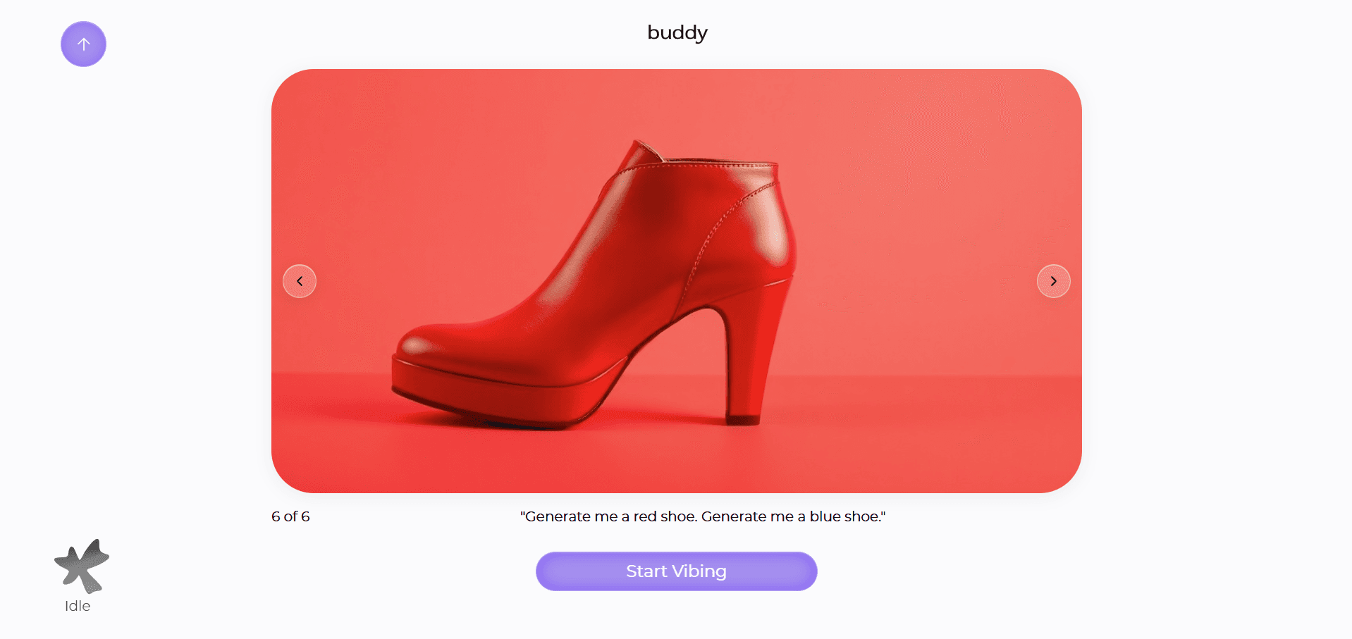 The original design featured a white background with purple buttons to evoke creativity. A simple “Start Vibing” button was included to suggest an enjoyable and fluid ideation process. The top portion displayed the amorphous AI logo for Buddy, reflecting a form that is both simple and open to interpretation. In the bottom left corner, a status indicator was placed to clearly communicate Buddy’s current state, ensuring the user could easily understand each phase of interaction.