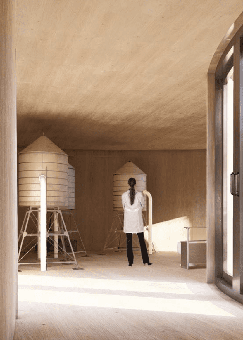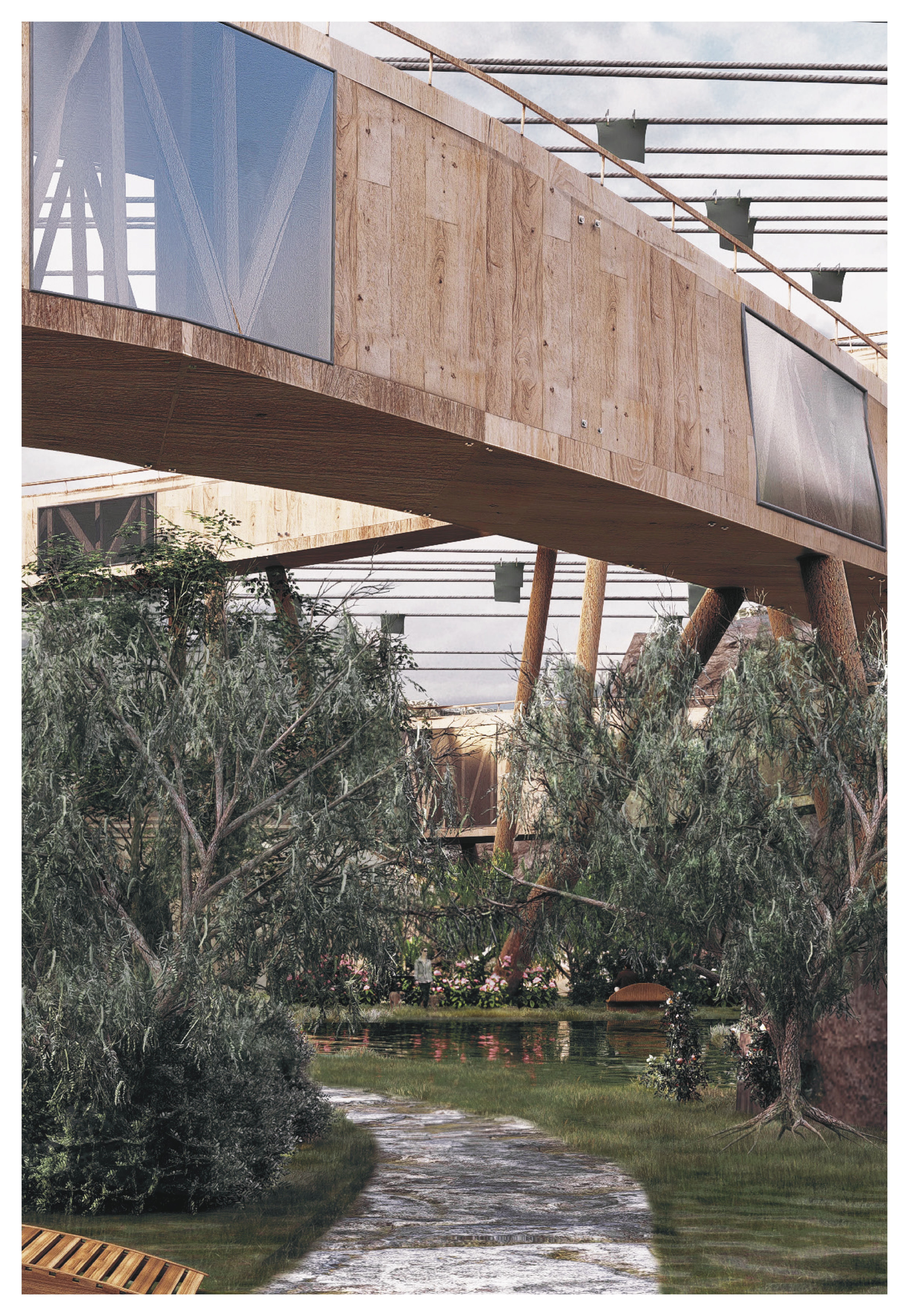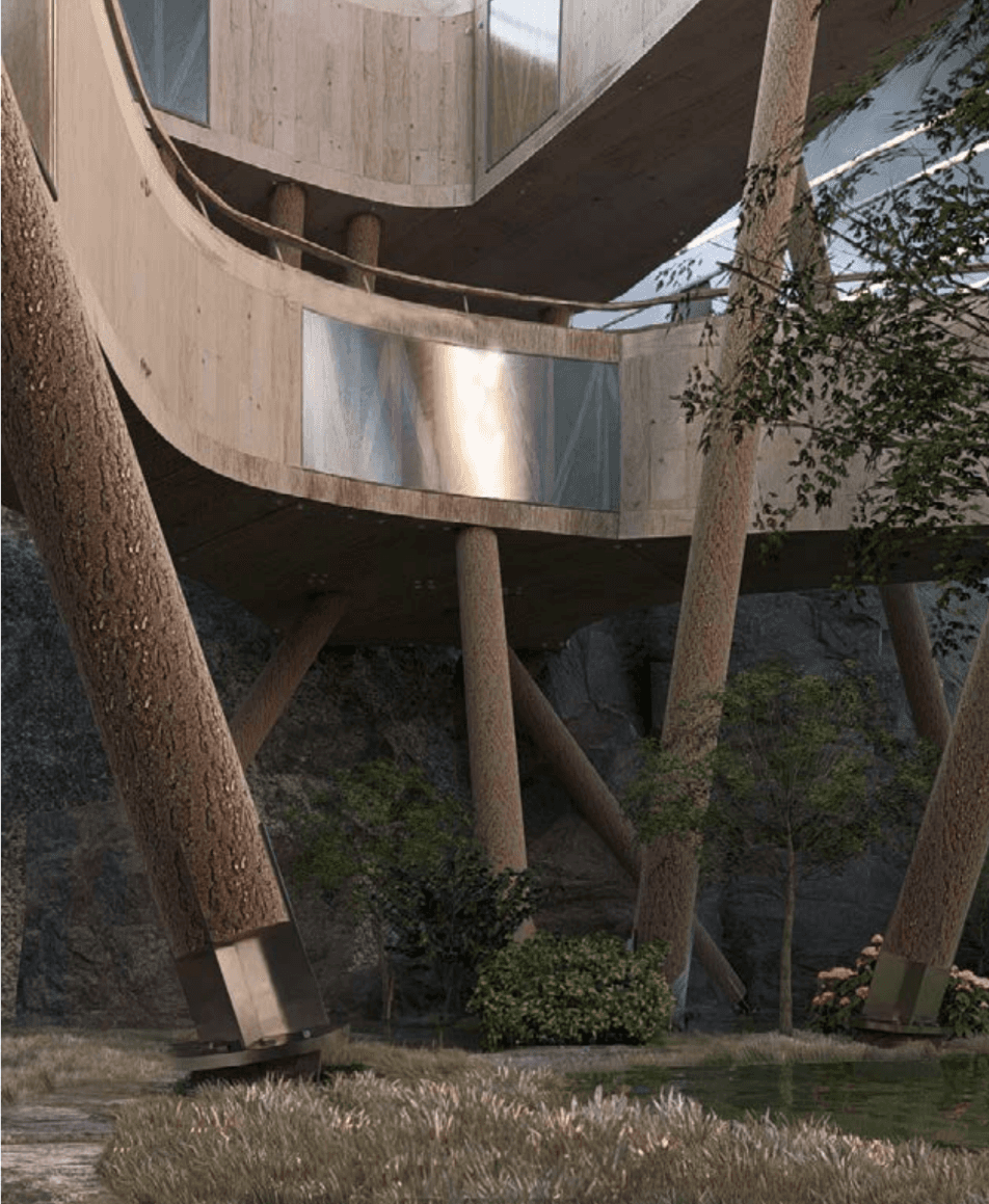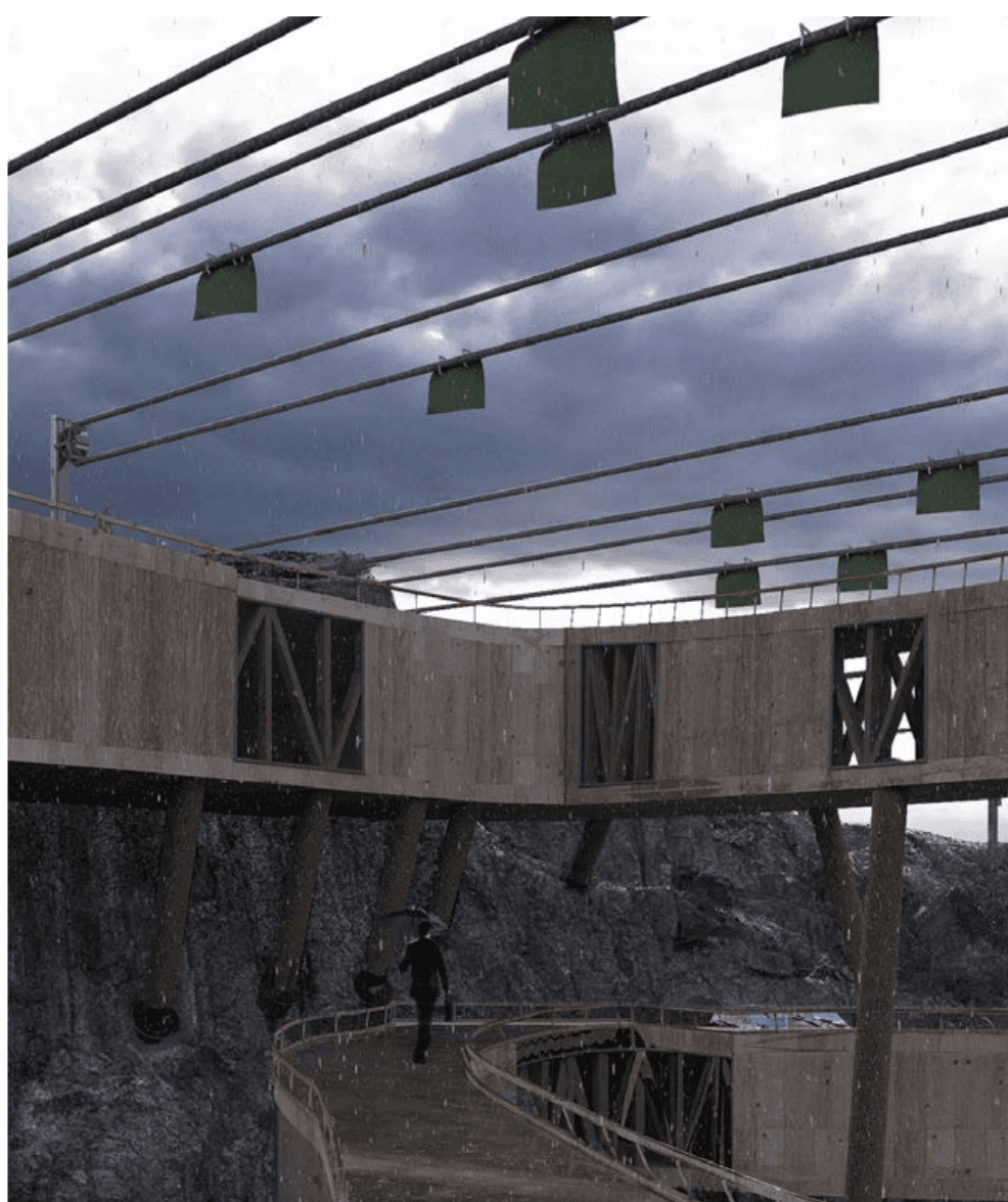 The building weaves together architecture, ecology, and textile production through the quiet labor of algae. Set within a former quarry, it draws strength from the site’s altered ground. Cultivation systems are embedded within the building’s elongated roof scape and the surrounding ponds, allowing algae to be grown and harvested in a continuous cycle. Inside, bio fabrication laboratories transform this living material into sustainable textiles, drawing from its high cellulose content to produce biodegradable yarns and dyes. In doing so, the project reclaims a post-industrial landscape and returns it to production, generating clothing through a closed loop that binds environmental restoration to circular design.