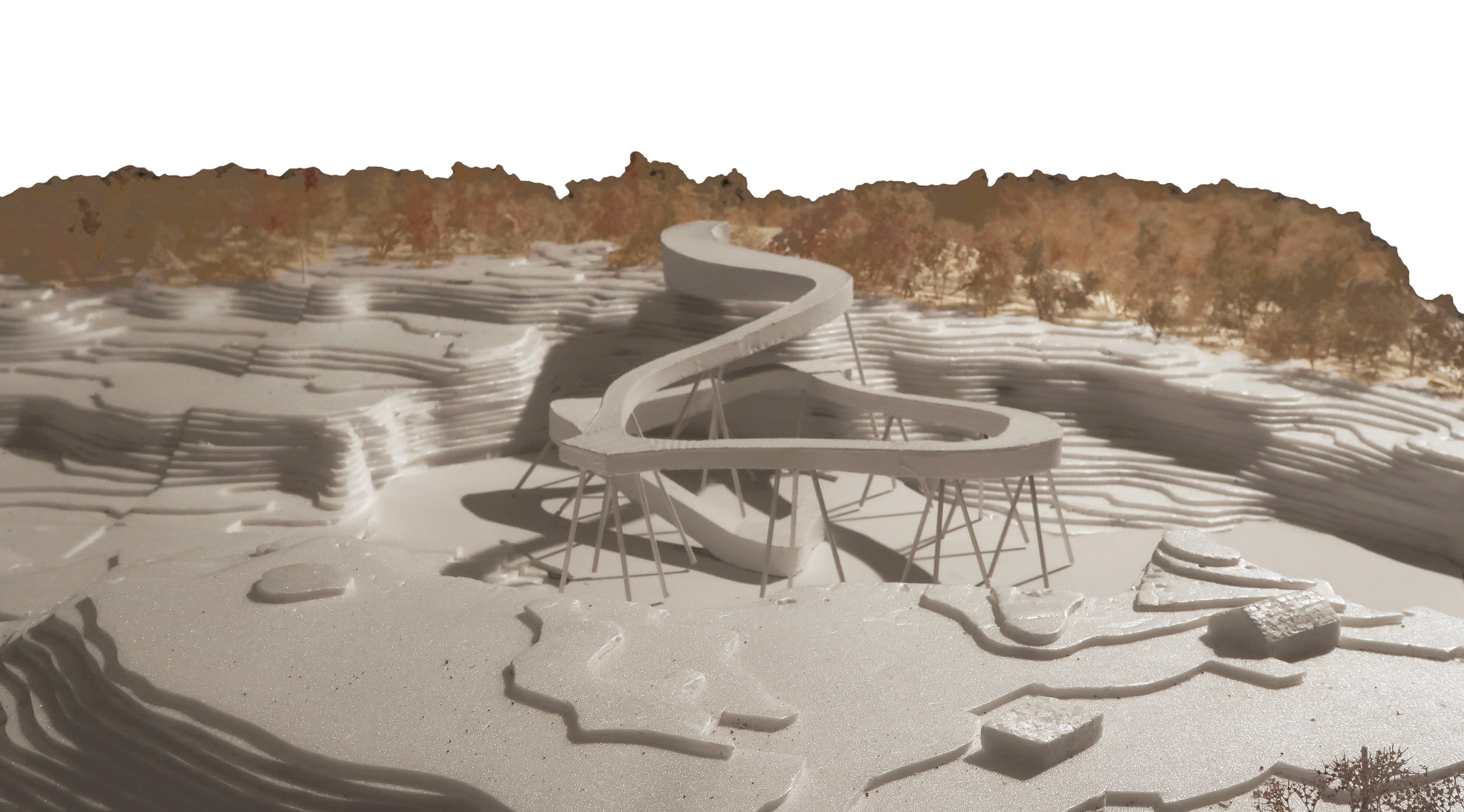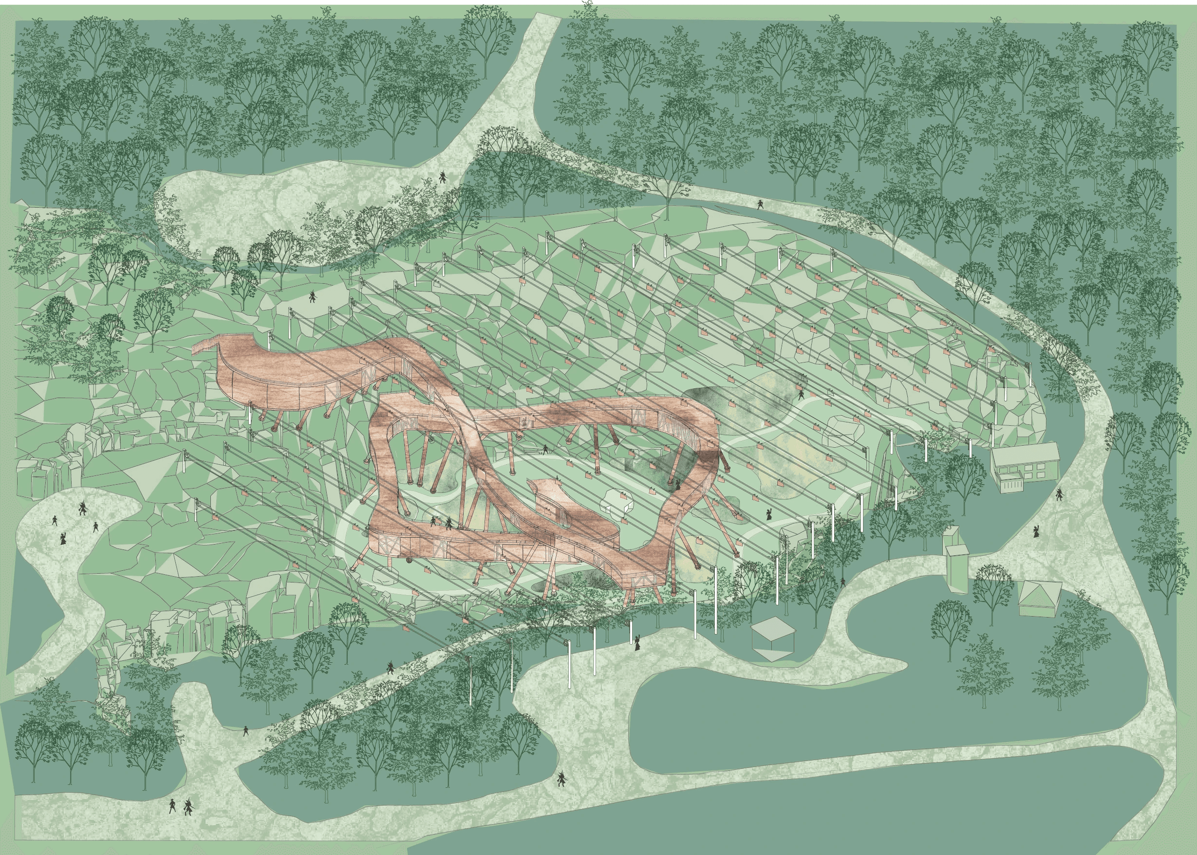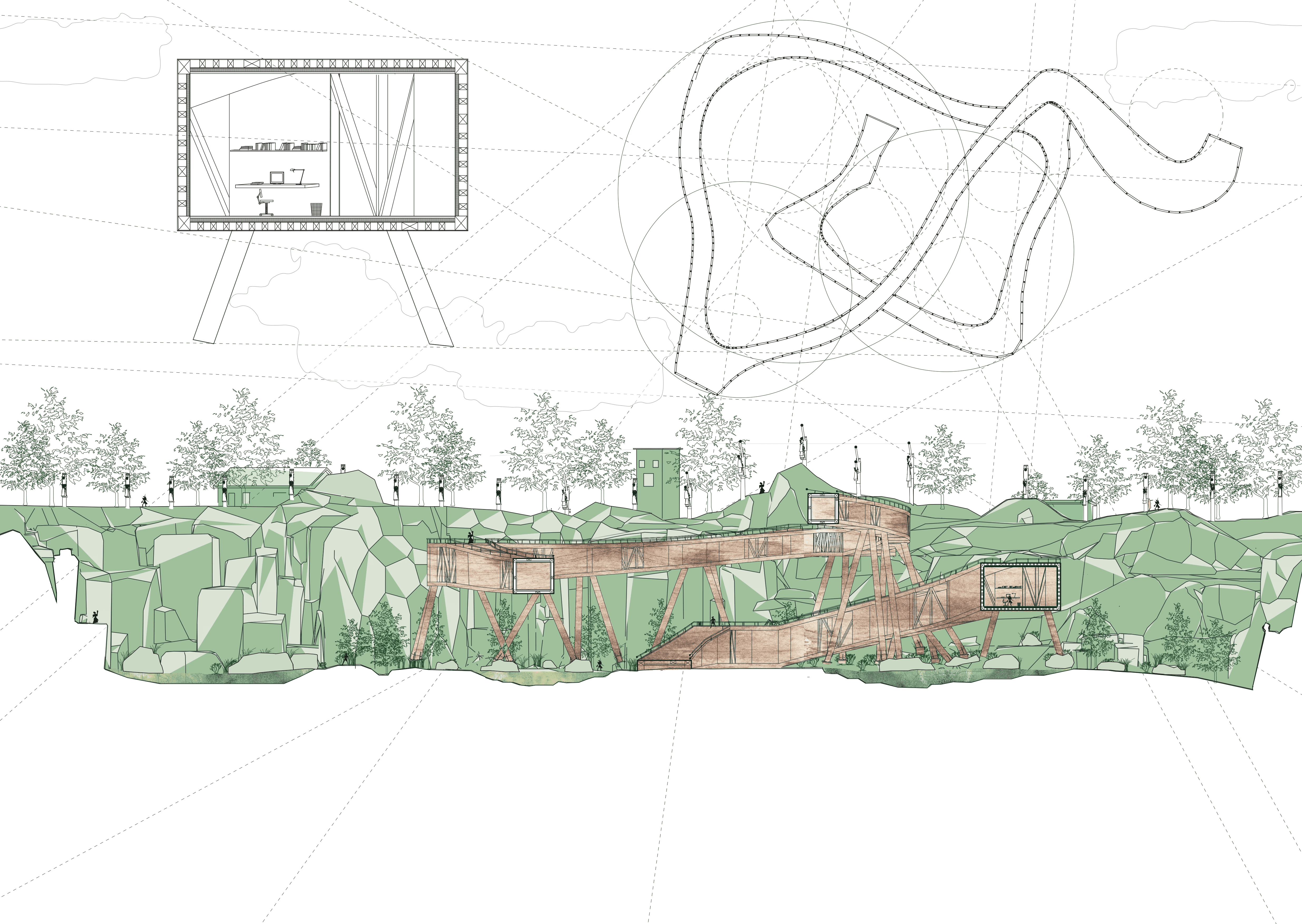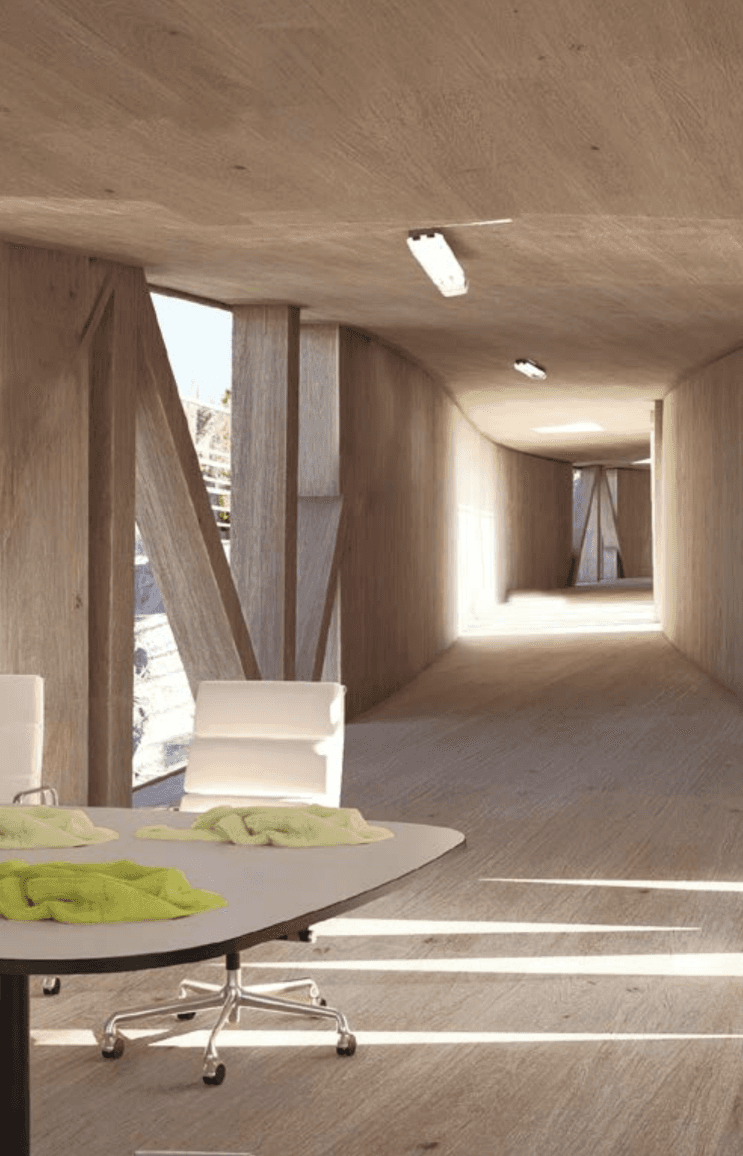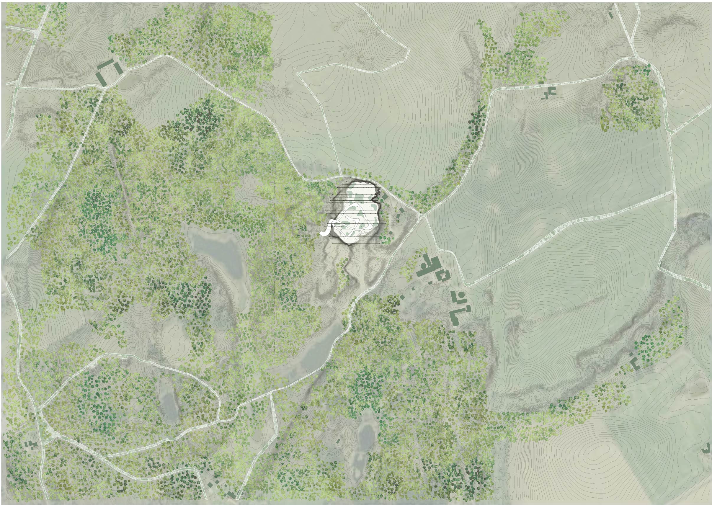 The building weaves together architecture, ecology, and textile production through the quiet labor of algae. Set within a former quarry, it draws strength from the site’s altered ground. Cultivation systems are embedded within the building’s elongated roof scape and the surrounding ponds, allowing algae to be grown and harvested in a continuous cycle. Inside, bio fabrication laboratories transform this living material into sustainable textiles, drawing from its high cellulose content to produce biodegradable yarns and dyes. In doing so, the project reclaims a post-industrial landscape and returns it to production, generating clothing through a closed loop that binds environmental restoration to circular design.