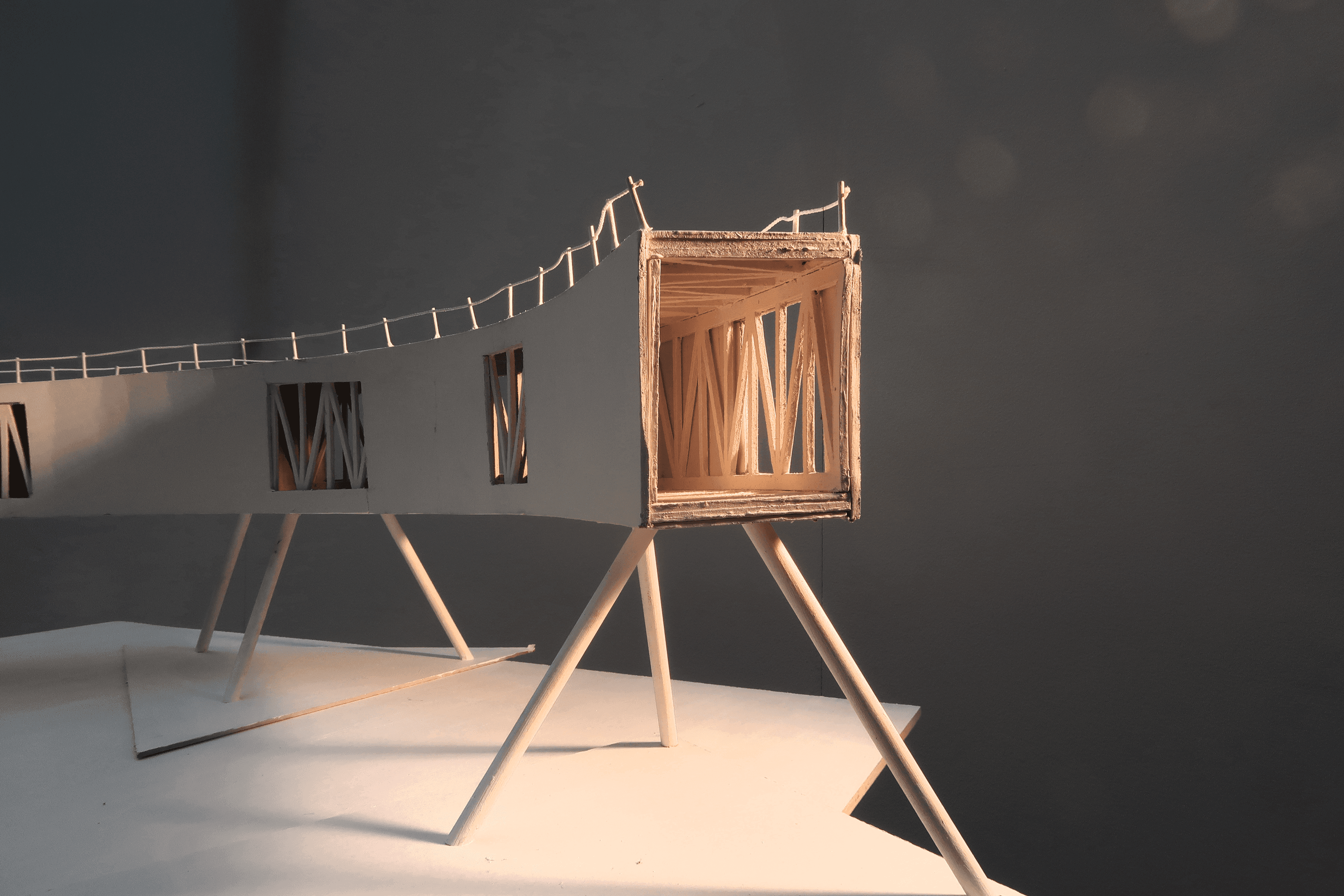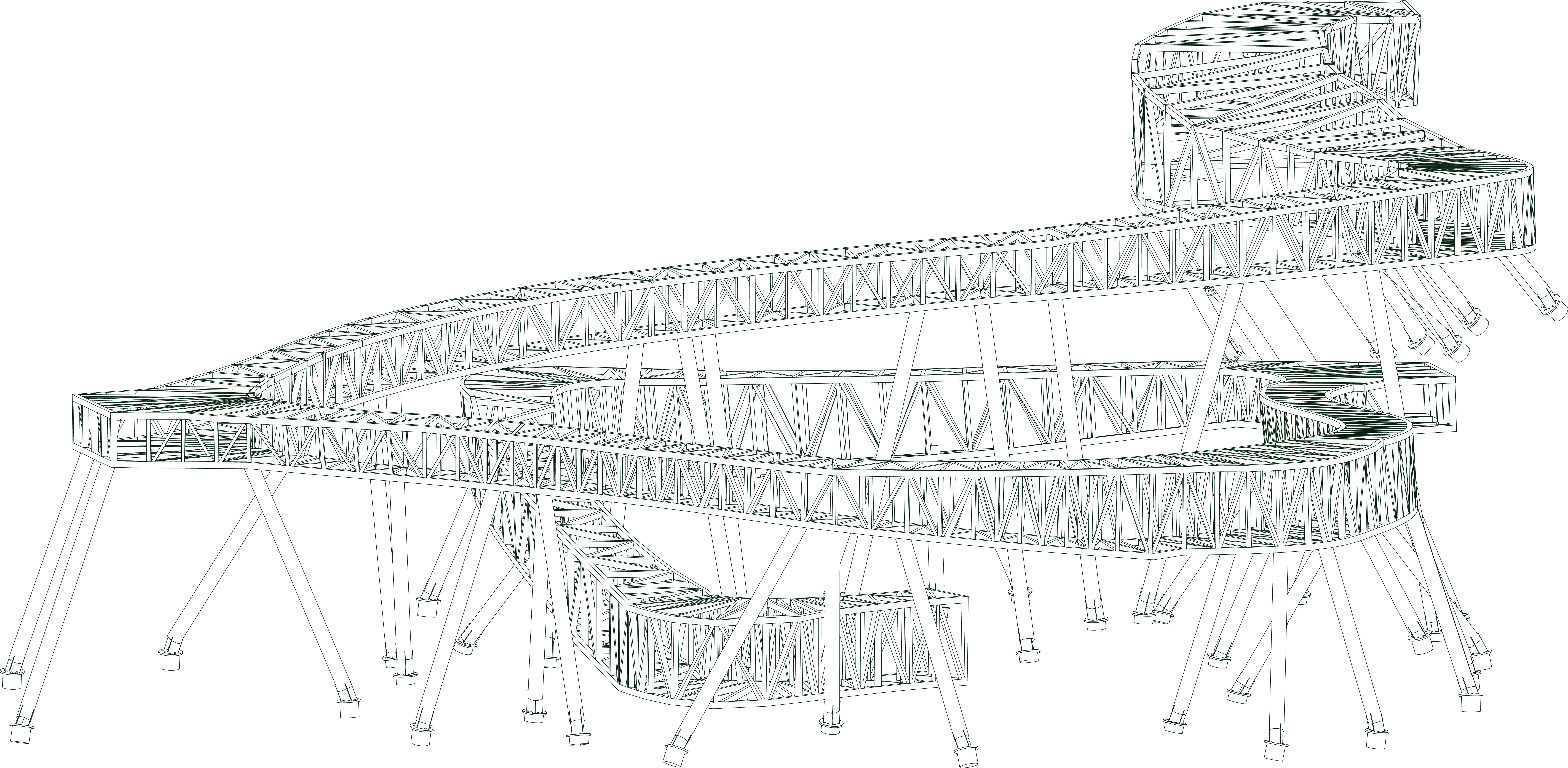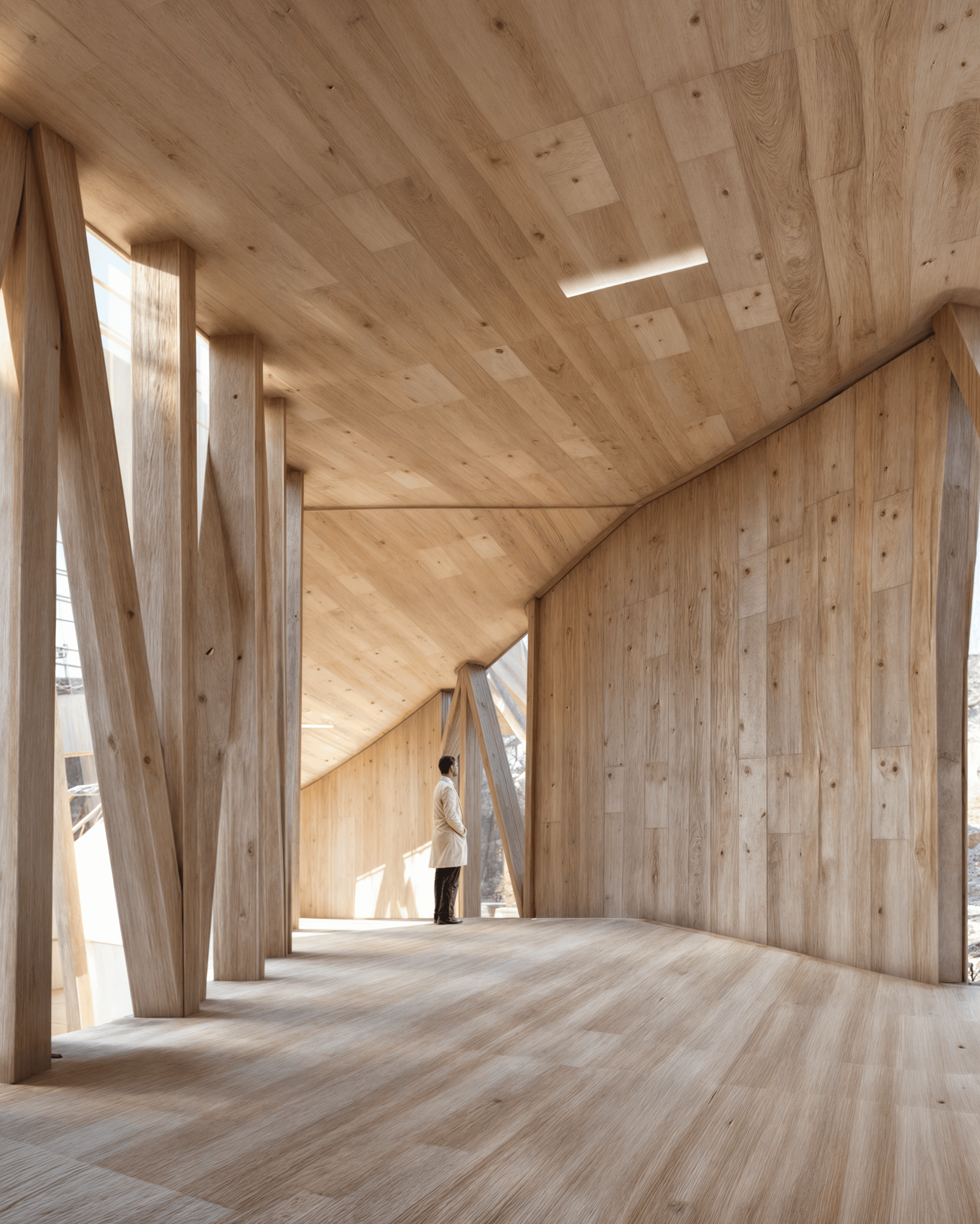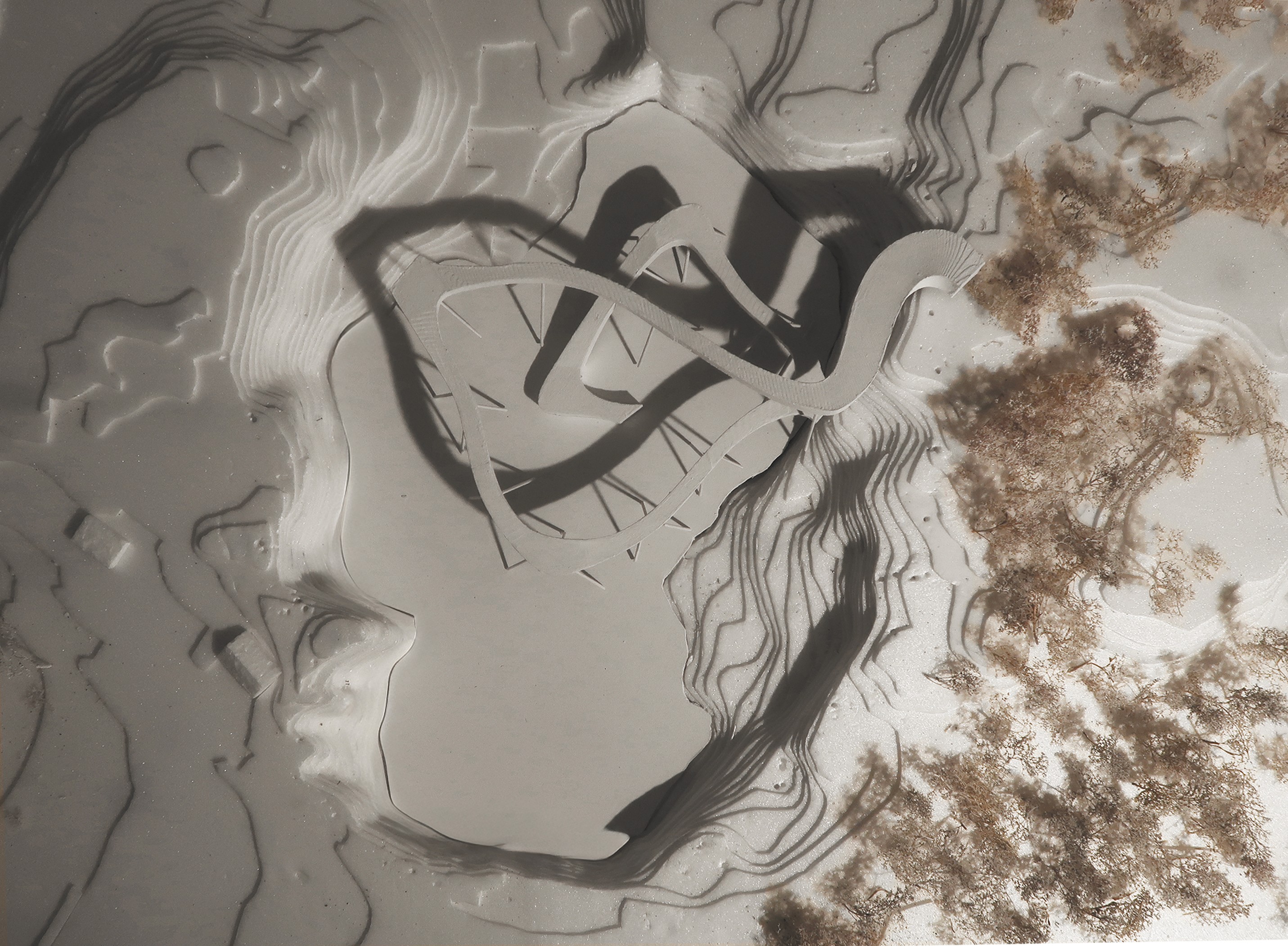 The building weaves together architecture, ecology, and textile production through the quiet labor of algae. Set within a former quarry, it draws strength from the site’s altered ground. Cultivation systems are embedded within the building’s elongated roof scape and the surrounding ponds, allowing algae to be grown and harvested in a continuous cycle. Inside, bio fabrication laboratories transform this living material into sustainable textiles, drawing from its high cellulose content to produce biodegradable yarns and dyes. In doing so, the project reclaims a post-industrial landscape and returns it to production, generating clothing through a closed loop that binds environmental restoration to circular design.