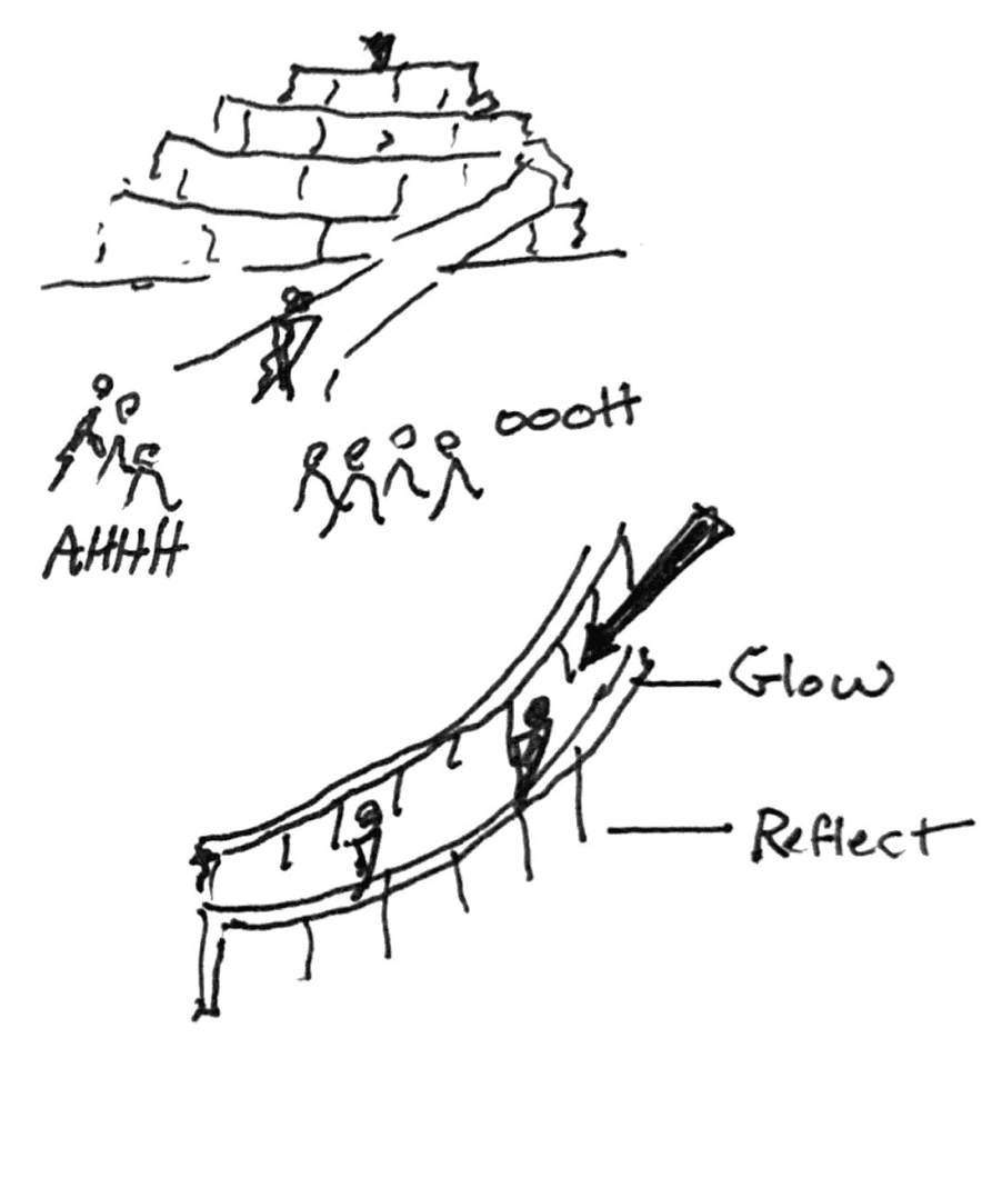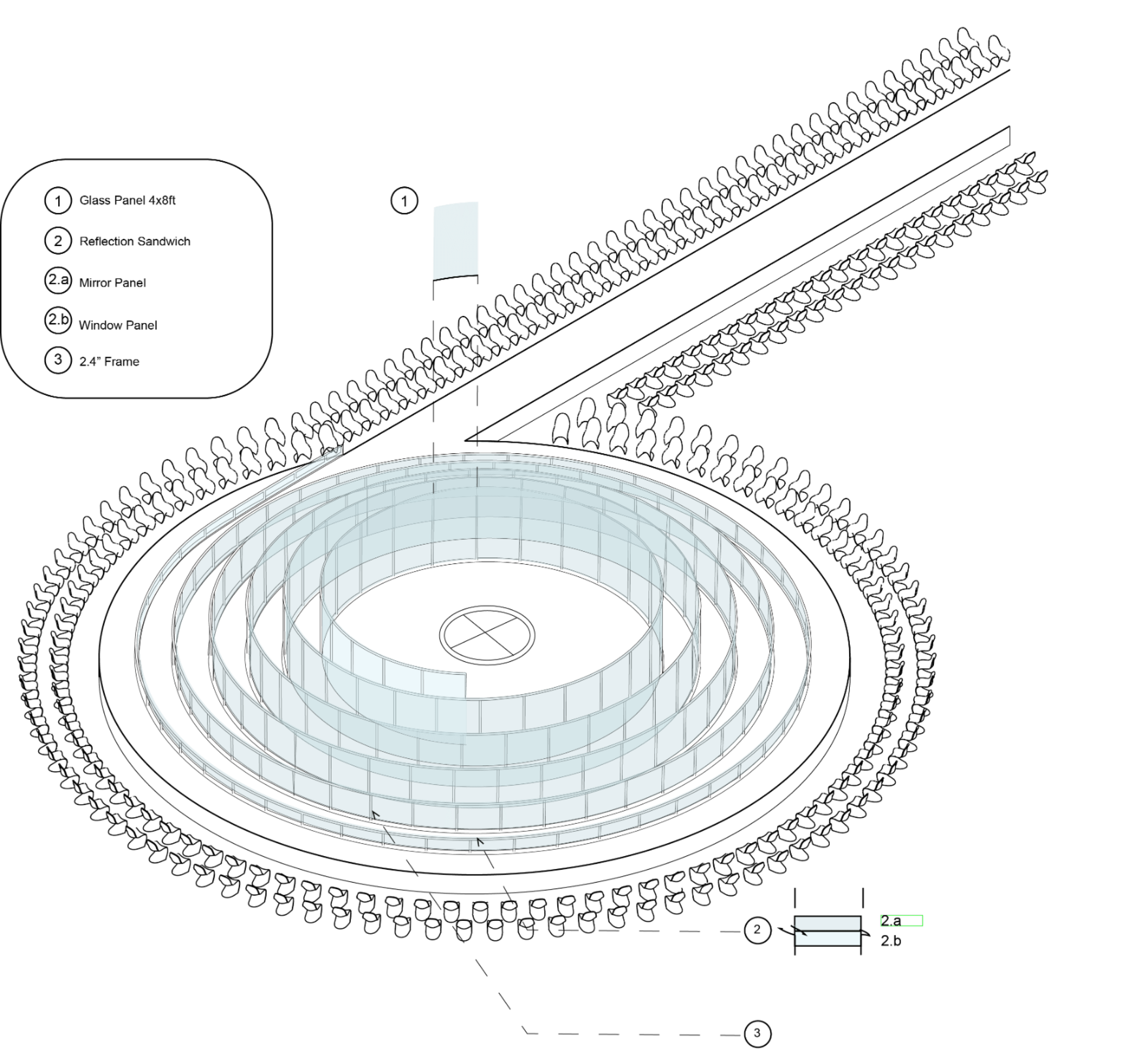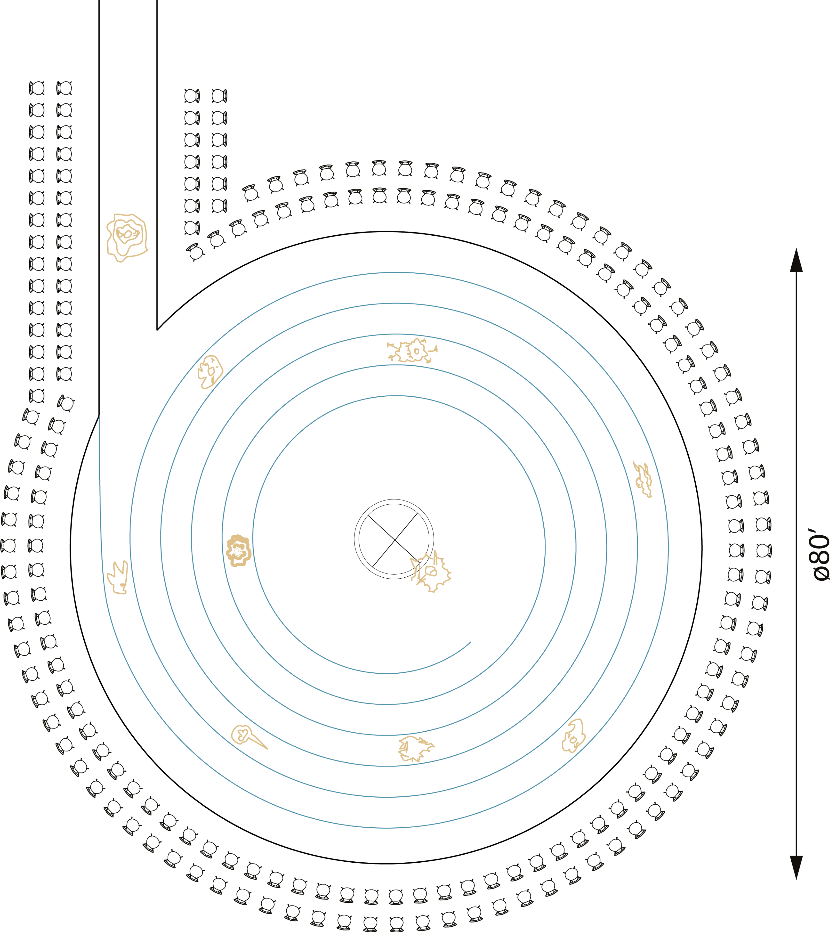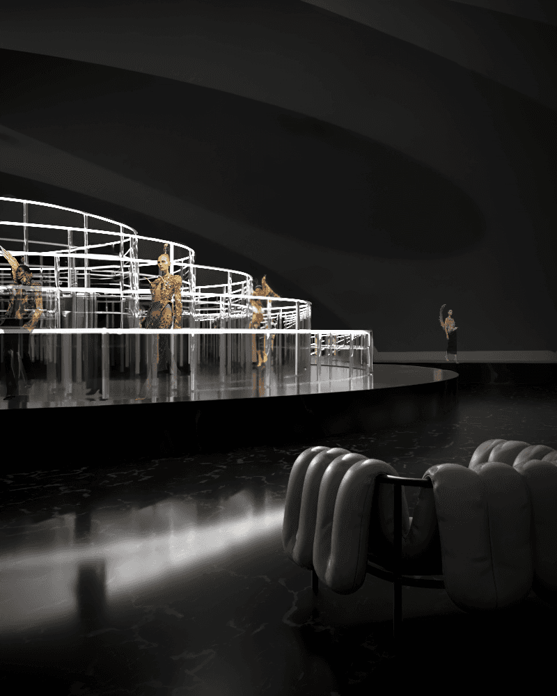 The designs of Schiaparelli are defined by a surreal, otherworldly energy, yet their runway environments often lack the same theatrical anticipation. The Spiral addresses this gap by gradually revealing each look through distorted lenses, creating suspense and fragmented perception. In the final moment, distortion falls away and the garment appears in its full, fortified beauty, aligning the scenography with the house’s surreal vision.